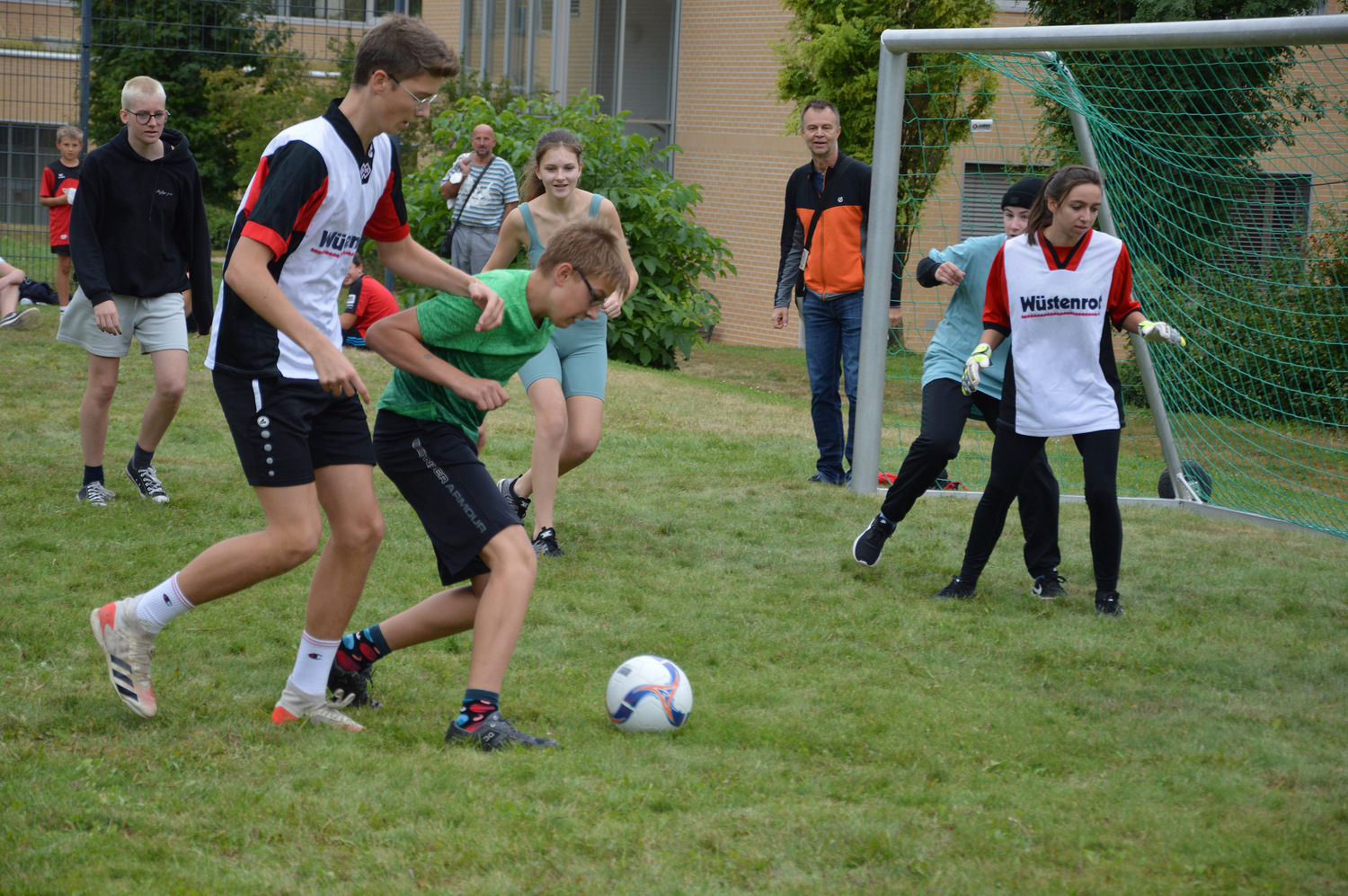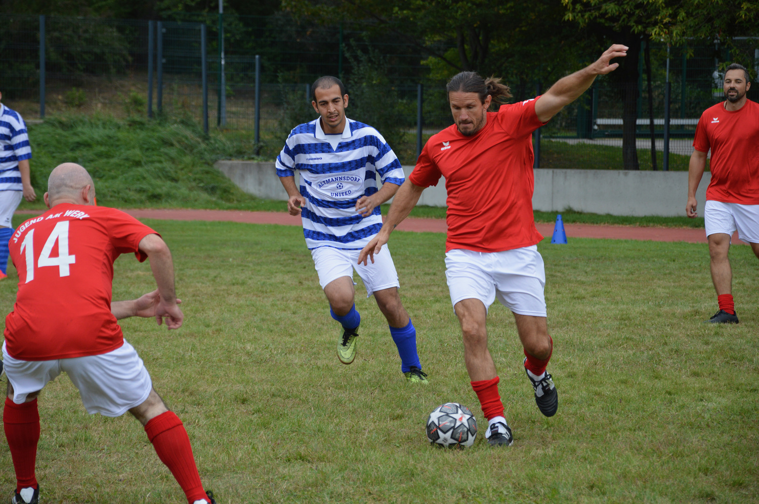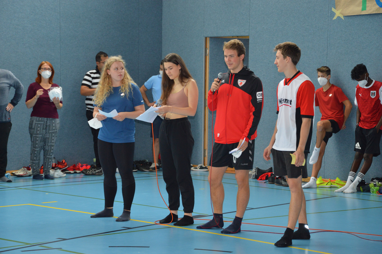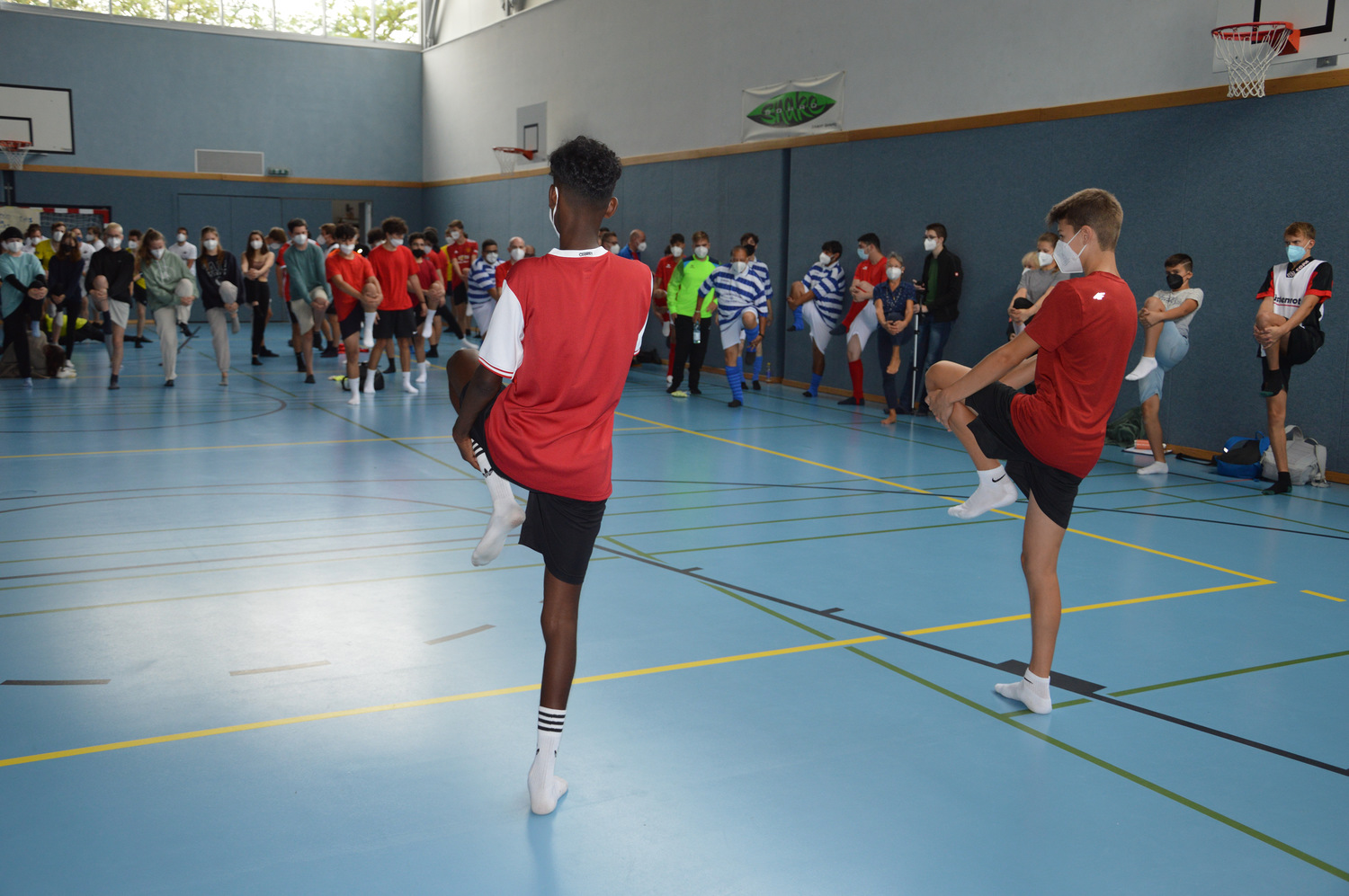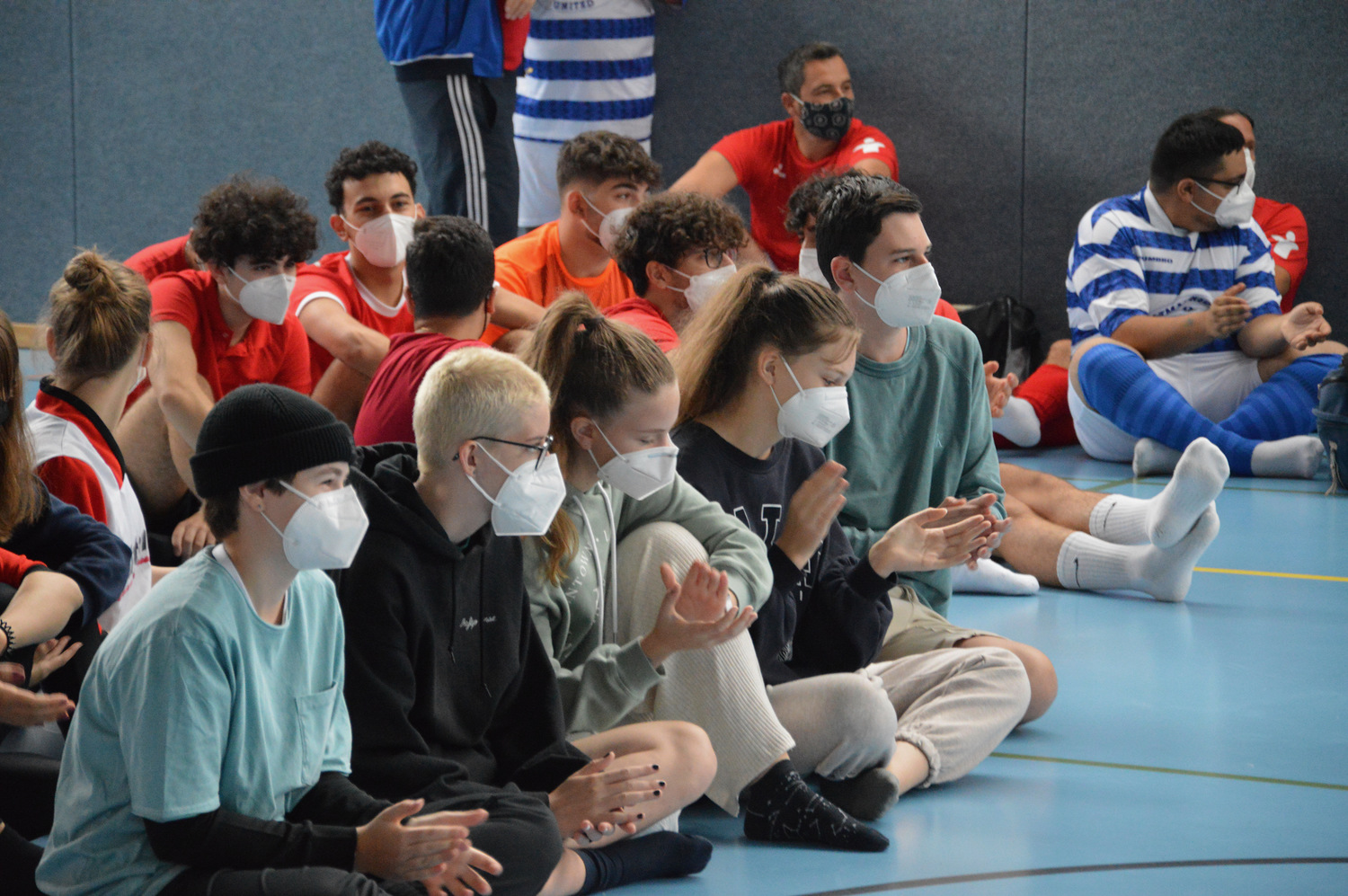 Masken-tragen beim Hallenpro-gramm, dann ein kurzer, hefiger Schauer am Nachmittag, der sowohl das Buffet und den Infostand als auch die Fußballplätze und die Spieler der ersten Matches nach der Mittagspause durchnässt hat.